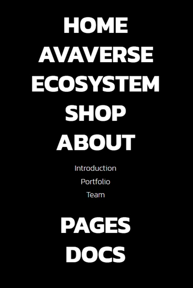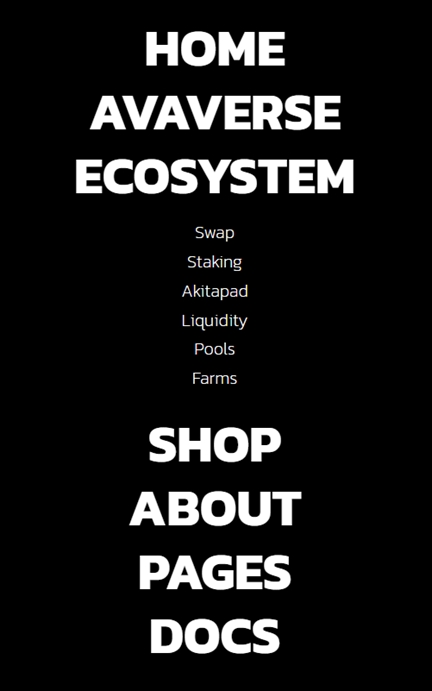 The new website has been designed to be user-friendly with a simpler interface. There is a welcome page as the landing page. The desired section can be accessed via the website menu in the upper right corner of the page. It is possible to switch to Home, Avaverse (Play&Earn games will be announced), Ecosystem (Swap, Staking, Akitapad, Liquidity, Pools, Farms), Shop (NFT Marketplace, Merchandise), About (Introduction, Portfolio, Team), Pages, Docs sections via the menu.